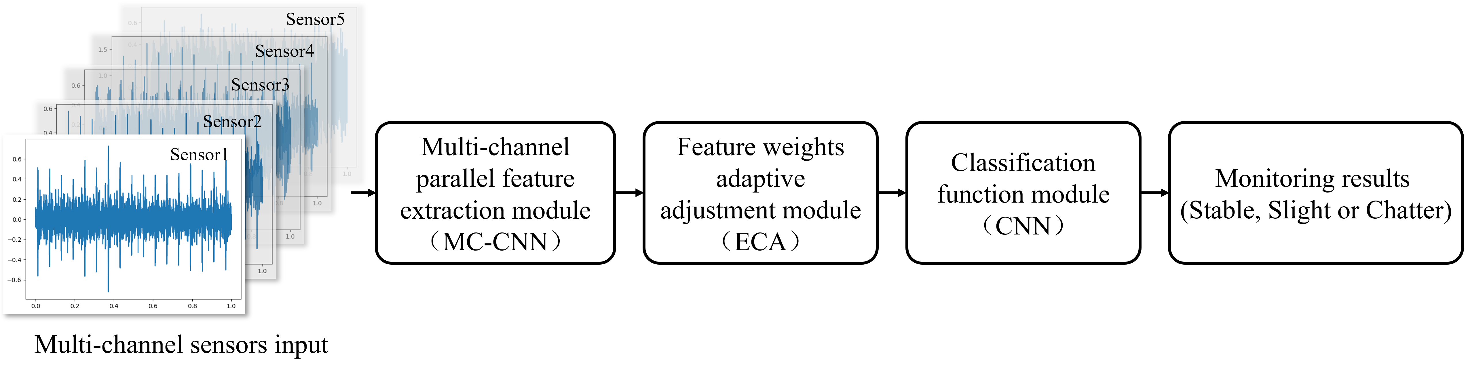 First, multi-channel sensor inputs are processed through the MC-CNN, which extracts critical features from the signals using two convolutional layers, each followed by max pooling layers to reduce the dimensionality while preserving important information. The ECA mechanism is then applied to the feature matrix, incorporating an average pooling layer to dynamically adjust the channel weights, enhancing the model’s ability to focus on relevant features while minimizing redundant information.