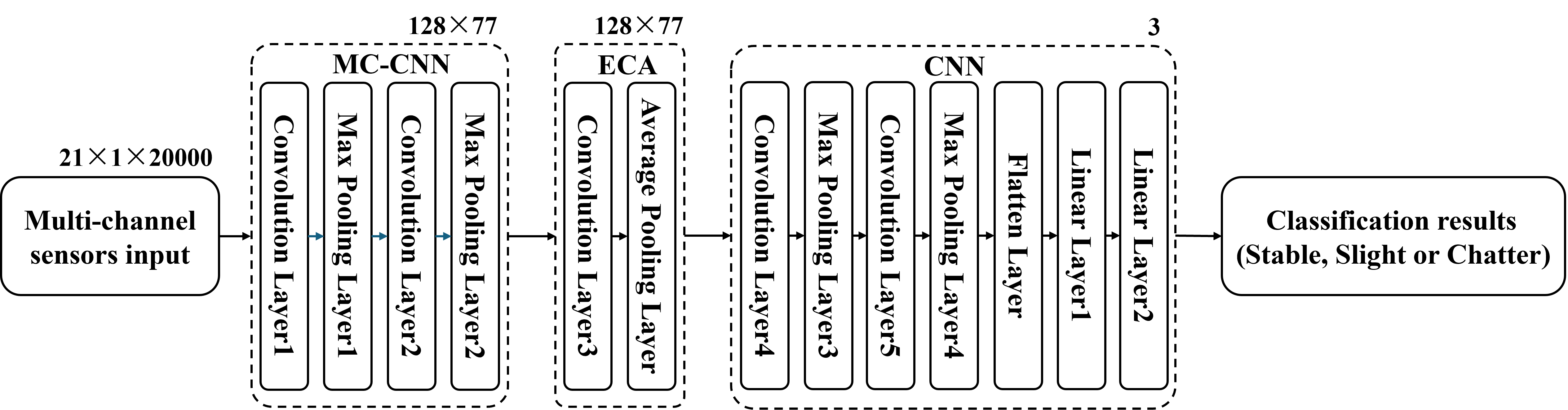 Finally, the refined feature maps pass through additional convolutional layers in the CNN, with max pooling operations for further abstraction. After flattening the data, two fully connected linear layers are used to perform the final classification, categorizing the machining state into one of three categories: Stable, Slight, or Chatter. This architecture improves computational efficiency and increases the accuracy of chatter detection.