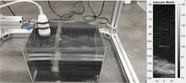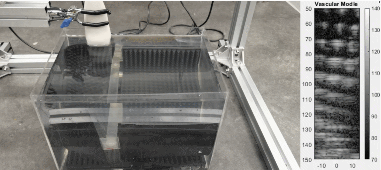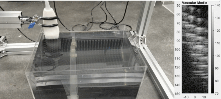 The robotic ultrasound system enables the ultrasound probe to automatically and continuously perform B-mode scanning along predefined trajectories. The custom-built probe is equipped with 64 transducers, and real-time B-mode images are captured using a CEPHASONICS acquisition module, generating IQ data. Simultaneously, the microcontroller provides real-time feedback on the probe’s position. Three experiments were conducted, scanning a vascular phantom along different trajectories. By processing the collected IQ data in MATLAB, real-time ultrasound images were obtained, demonstrating the system’s effectiveness in automated scanning and data acquisition.