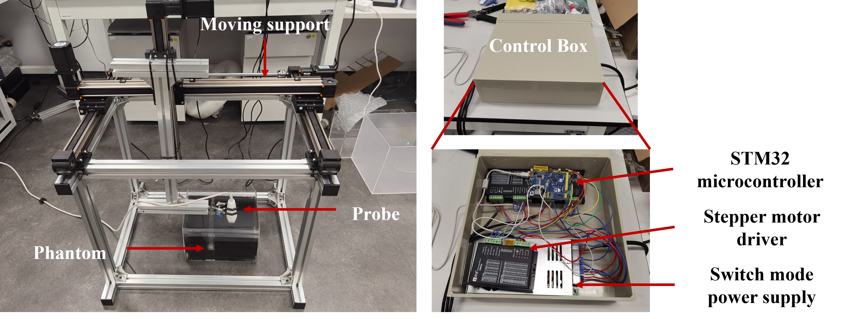 The robotic ultrasound system is designed with a custom-built slide platform based on synchronized conveyor belts, enabling precise movement of the ultrasound probe. Developed using the STM32 microcontroller, the control algorithm allows the probe to move freely along the X, Y, and Z axes. The system calculates real-time position data based on motor characteristics, ensuring accurate control and feedback. This setup provides a robust and flexible solution for automated probe positioning, essential for applications in medical imaging and robotic-assisted diagnostics.